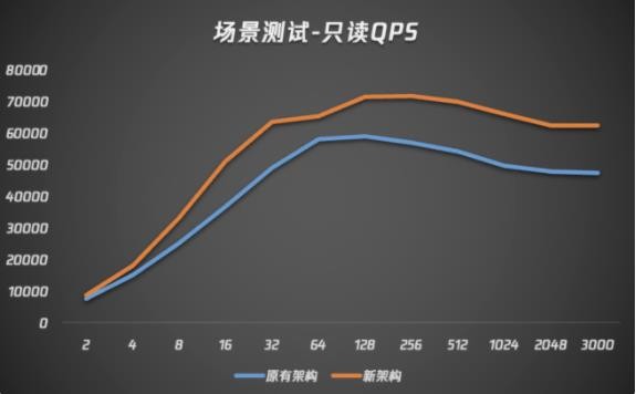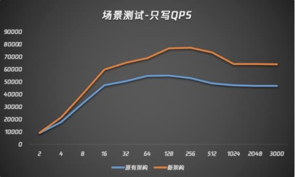 在只讀場景下,低線程數時搭載了新一代內核的騰訊云數據庫 MySQL 的 QPS 增幅較大,趨近直線上升,在線程數達到 64 以后 QPS 上升平緩,總體性能始終高于上一代版本,且在線程數為 16 時,提升更是達到了近 25%。