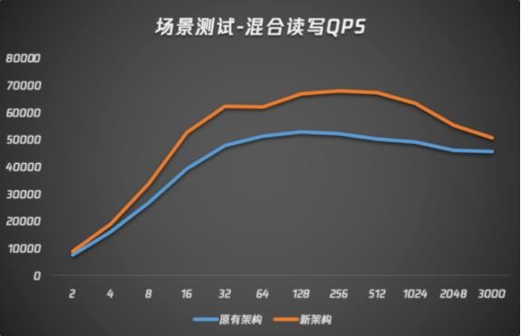 在混合讀寫場景下,低線程數時搭載了新一代內核的騰訊云數據庫 MySQL 的 QPS 增幅較大,最高時達到近 20% 的提升。