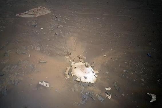 Ingenuity 直升機拍到丟棄在火星上的漫游車降落設備。