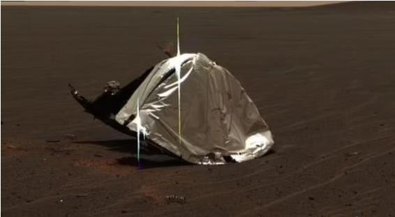 “毅力號”探測器著陸時的熱毯如今丟棄在火星上。