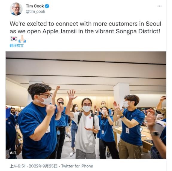 蘋果剛在韓國首爾新開設了一家 Apple Store 官方零售店,據悉,蘋果蠶室店是這家科技巨頭在韓國開設的第四家門店。為了慶祝開業,蘋果 CEO 庫克還特意為其獻上祝福,并附了一張該店首批顧客被員工包圍的照片。