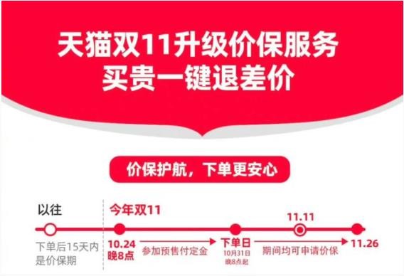 據淘寶最新消息,為了更好地保護消費者權益,今年天貓雙十一對價保規則做了升級,將原來的付款后 15 天內價保,改為 11 月 11 日活動結束后 15 天內全程價保,最長價保時間可以延長至 27 天。如果小伙伴們發現,此前購買帶價保標識的產品出現降價,都可以直接發起價保申請。