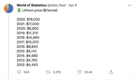 統計世界(World of Statistics)在推特上曾列出了過去 20 年每噸鋰的平均價格。自 2021 年以來,全球鋰價一直大幅上漲;俄烏沖突后,鋰價更是加速飆升。