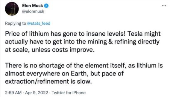 鋰的價格已經達到了瘋狂的水平!除非成本提高,否則特斯拉實際上可能不得不直接大規模進入(鋰礦)開采和精煉領域。