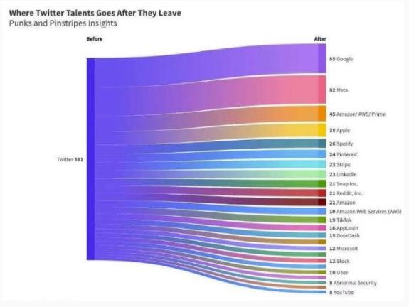 Punks&Pinstripe 分析發現,在過去三個月離開推特的員工中,近 30% 的人去了谷歌或 Meta。與此同時,還有數十個人轉到了其他頂級社交平臺上,包括 Pinterest、LinkedIn、Snap 和 TikTok 等。Punks&Pinstripe 首席執行官格雷格·拉金(Greg Larkin)也指出,許多推特員工轉到了初創企業。