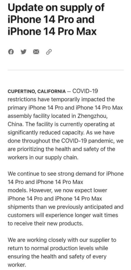 蘋果對 iPhone 14 Pro 和 iPhone 14 Pro Max 目前的供應情況做出最新聲明。蘋果稱,富士康鄭州工廠目前的產能大幅降低,iPhone 14 Pro 和 iPhone 14 Pro Max 的出貨量將低于預期。