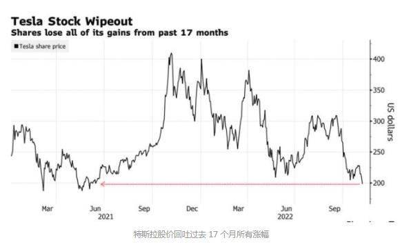 隨著投資者在埃隆?馬斯克 (Elon Musk) 收購推特后繼續拋售特斯拉股票,特斯拉股價抹掉了過去 17 個月的所有漲幅。