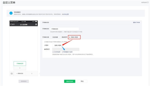 7.如果需要點擊跳轉到小程序,那就選擇第三個跳轉小程序,然后在下面選擇上關聯著公眾號的小程序,這里需要注意,小程序要和公眾號關聯才可以。(在左側標簽小程序管理內進行關聯)