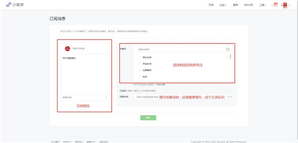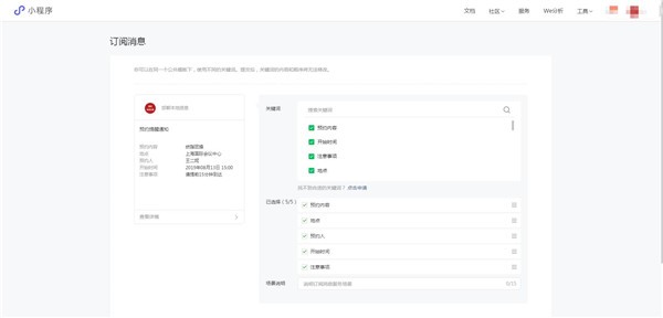 4.比如我們選擇預(yù)約提醒通知,點擊選用進(jìn)入設(shè)置,選好程序需要的消息類型條目,例如我們選擇:預(yù)約內(nèi)容,地點,預(yù)約人,開始時間,注意事項,就再這些條目前選上√,保存即可添加成功。
