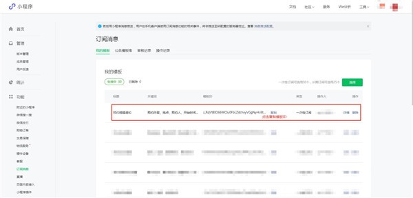 5.添加成功后我們就可以看到訂閱消息列表就有了這一條剛添加的信息,點擊復(fù)制模板ID,粘貼到程序里需要的位置即可使用成功。