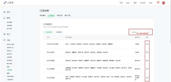 3.點擊選用按鈕就可以去搜索自己想要的訂閱消息了,在輸入框中輸入消息標(biāo)題,然后點擊搜索按鈕搜索出自己想要的消息,點擊選用進(jìn)入訂閱消息設(shè)置。