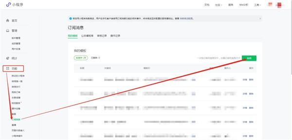 2.在左側(cè)菜單功能處找到訂閱消息,點擊進(jìn)入后就可以看到添加訂閱消息的地方了,不同的類目可以添加不同的訂閱消息類型,要先給小程序設(shè)置好類目再設(shè)置模板消息。