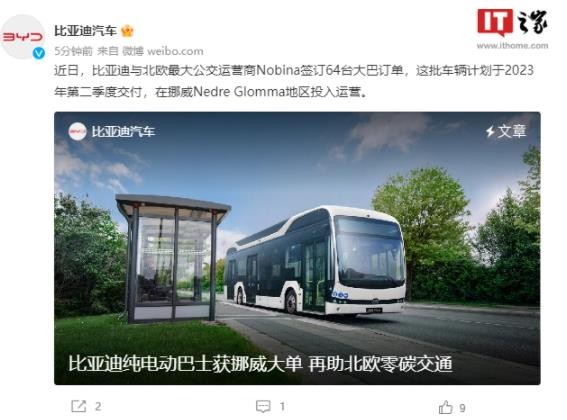 據比亞迪官微,近日,比亞迪與北歐最大公交運營商 Nobina 簽訂 64 臺大巴訂單,這批車輛計劃于 2023 年第二季度交付,在挪威 Nedre Glomma 地區投入運營。