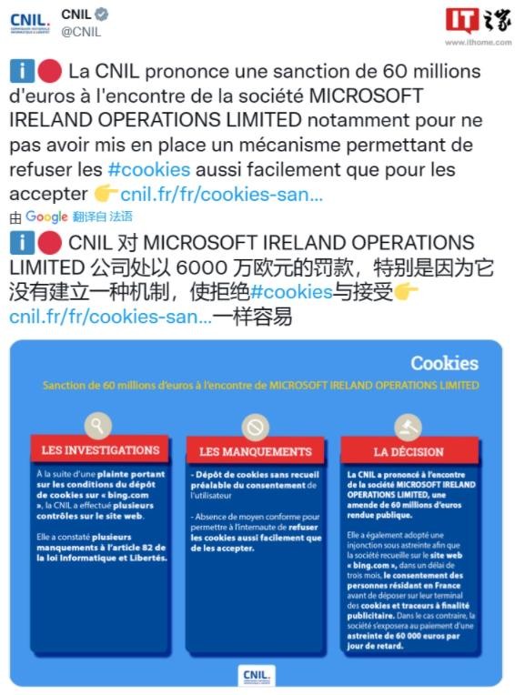 法國國家數(shù)據(jù)保護(hù)委員會 (CNIL) 周四表示,已對微軟愛爾蘭公司處以 6000 萬歐元(約 4.45 億元人民幣)罰款,因為該公司沒有建立一種機(jī)制,讓人們像接受 Cookie 一樣容易地拒絕 Cookie。