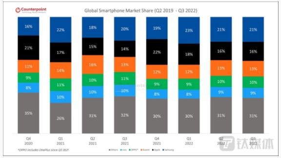 三星在 2022 年第三季度出貨量為 6400 萬臺(tái),同比下降了8%,市占率 21% 仍為全球第一。