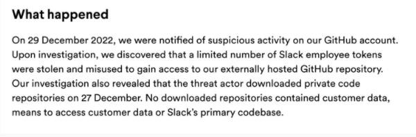 2022 年 12 月 29 日,我們被告知我們的 GitHub 賬戶上有可疑活動。經調查,我們發現數量有限的 Slack 員工令牌被盜,并被濫用于訪問我們外部托管的 GitHub 倉庫。我們的調查還顯示,黑客在 12 月 27 日下載了私有代碼庫。下載的倉庫沒有包含客戶數據、訪問客戶數據的手段或 Slack 的主要代碼庫。