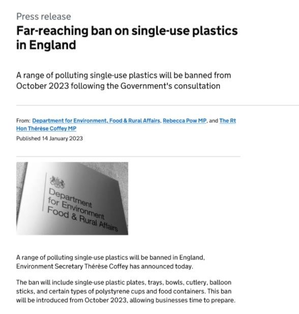 英國(guó)環(huán)境、食品和鄉(xiāng)村事務(wù)部本周六宣布,英國(guó)將于年底前開始禁止企業(yè)銷售和提供餐盤、餐具等一次性塑料用品。這項(xiàng)法律將于 2023 年 10 月在英國(guó)全面生效推廣。