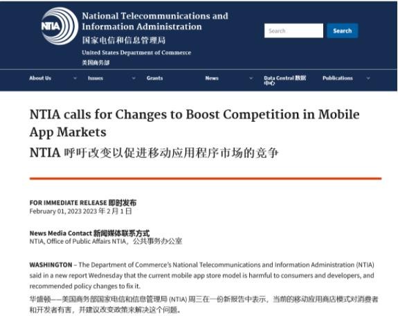 NTIA 在今天發(fā)布的《NTIA 呼吁改變以促進(jìn)移動(dòng)應(yīng)用程序市場(chǎng)的競(jìng)爭(zhēng)》公告中表示,蘋(píng)果 App Store 和谷歌 Play Store 現(xiàn)有的移動(dòng)應(yīng)用商城模式對(duì)消費(fèi)者和開(kāi)發(fā)者有害,并建議改變政策來(lái)解決這個(gè)問(wèn)題。