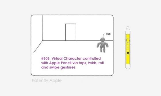 該專利的主要內容如下:在下面的圖 1 和圖 6B 上,我們看到一個用戶拿著 Apple Pencil,在這種情況下,它被用作游戲控制器來移動對象或游戲角色,蘋果稱之為“虛擬代理”(Virtual Agent)#606。Apple Pencil 的功能將包括涉及在 Pencil 的觸摸表面上敲擊、滾動、旋轉、輕彈和滑動的輸入。