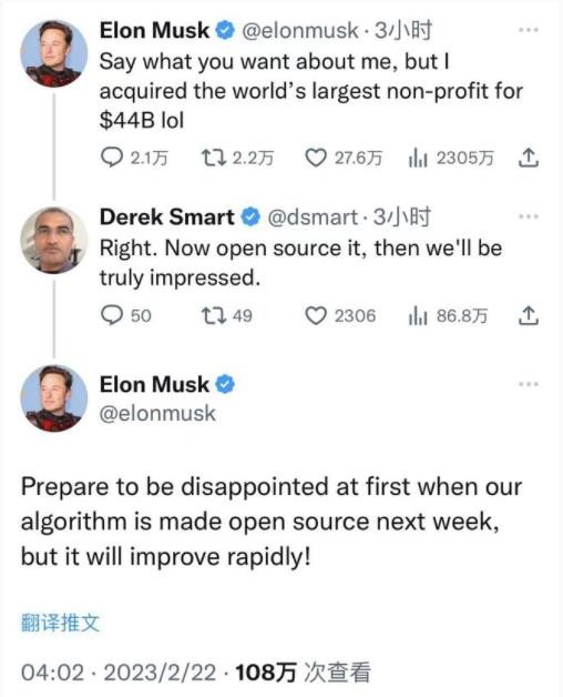 馬斯克回復(fù)用戶(hù)推文時(shí)表示 推特將下周開(kāi)源算法 15:05:26