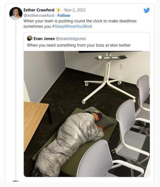 去年 11 月初,克勞福德還在推特上發布了一張自己睡在推特辦公室地板上的照片,包括睡袋和眼罩。她同時寫道:“當你的團隊日以繼夜地趕在最后期限前努力工作時,有時你需要睡在辦公室中。”