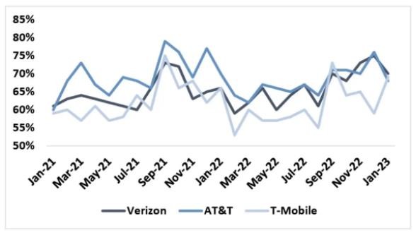 摩根大通在報(bào)告中指出:“iPhone 今年 1 月在美國(guó)三大運(yùn)營(yíng)商(Verizon、AT&T 和 T-Mobile)中的銷(xiāo)售份額為 69%,去年 12 月為 70%。但表現(xiàn)比前代更優(yōu)秀,iPhone 13 周期中的占比為 67%;而 iPhone 12 周期中的占比為 60%”。
