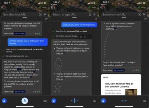 網(wǎng)友 Michael P.Frank 詢問必應(yīng)聊天,如何區(qū)分“hail”(冰雹)和“sleet”(雨夾雪)兩個單詞。必應(yīng)聊天通過 ASCII 圖稿的方式展示了兩者的區(qū)別,表示“冰雹”出現(xiàn)在“汽車”上,“雨夾雪”出現(xiàn)在“道路”上。