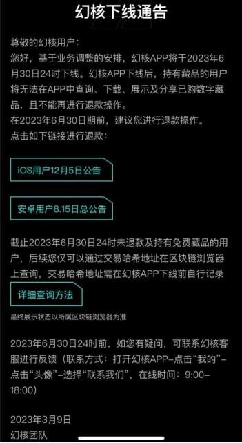 幻核 APP 下線后,持有餐品的用戶將無法在 APP 中查詢、下載、展示及分享已購數字藏品,且不能再進行退款操作。