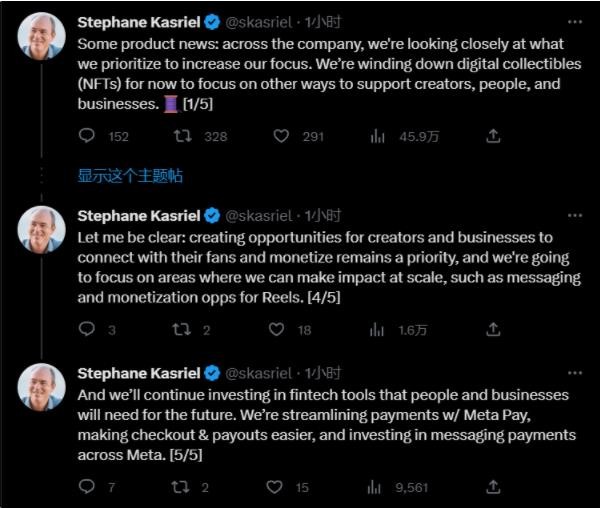 去年,該公司為數字藏品支持創作者推出了在 Instagram 和 Facebook 上分享 NFT 內容的服務,因為當時這種投機性的加密資產深受歡迎,甚至從卡通猩猩到視頻剪輯各種內容所產生的銷售額一度達到了數十億美元。
