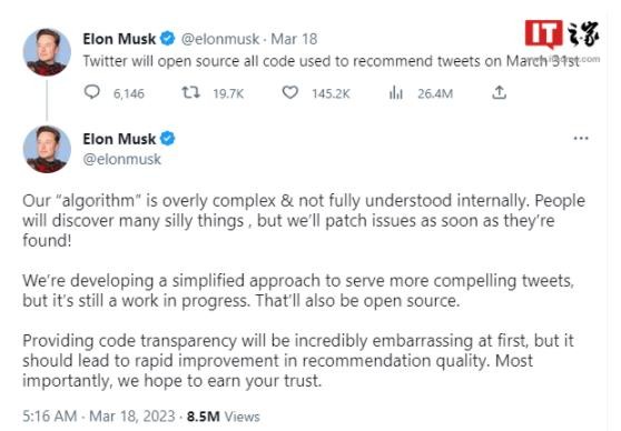 馬斯克近日發布推特表示,推特將于 3 月 31 日開源所有用于推文推薦機制的代碼。