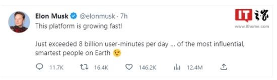 馬斯克今日還發推文稱,“推特的增速很快,每天所有用戶在該平臺上的總分鐘數已經達到 80 億。”