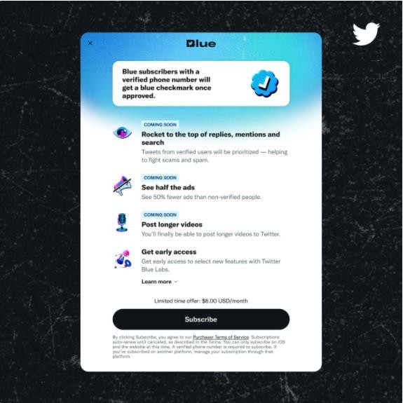 購買 Twitter Blue 訂閱服務(wù)的用戶在賬號上會附加一個藍(lán)色的復(fù)選標(biāo)記,并可以提前訪問獨家功能。新的 Twitter 賬戶需要等待 30 天才能訂閱該服務(wù)。