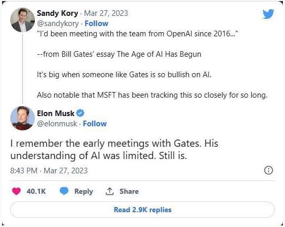 隨后,馬斯克在推特上跟帖了這條推文。他寫道:“我記得與蓋茨的早期會面。他對 AI 的理解十分有限。現在依然如此。”