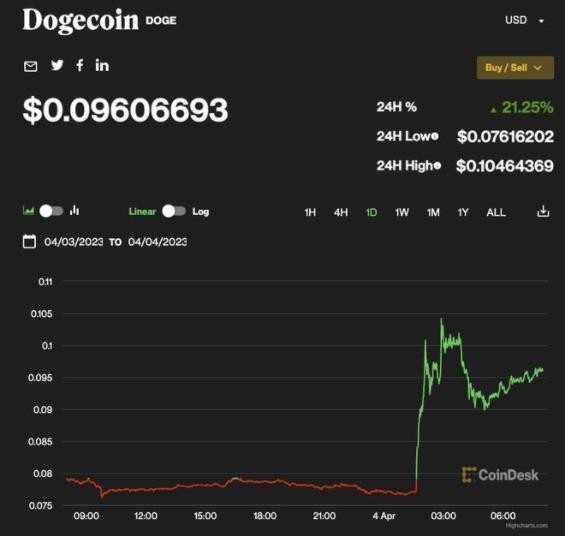 加密貨幣狗狗幣價格一度飆升超過 30%,現(xiàn)漲 21.25%。此前推特 CEO 埃隆·馬斯克將公司網(wǎng)站上標志性的“小藍鳥”換成了“柴犬”卡通形象。 (碼上科技)