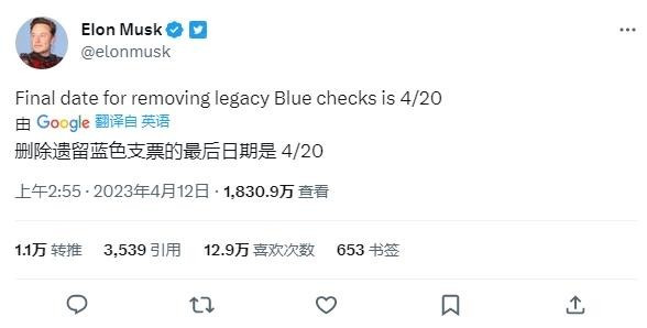 埃隆?馬斯克(Elon Musk)在最新推文中宣布,將于 4 月 20 日之前完成遺留 Twitter 賬號的清理工作,確保尚未購買 Twitter Blue 服務的賬號不會顯示藍色驗證徽章。
