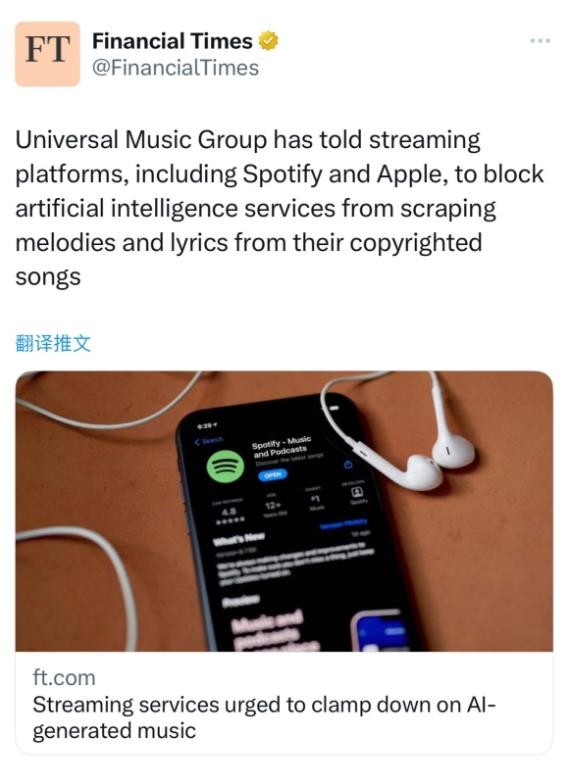環球音樂集團已告知包括 Spotify 和蘋果在內的流媒體平臺,應防止人工智能服務從其受版權保護的歌曲中抓取旋律和歌詞。