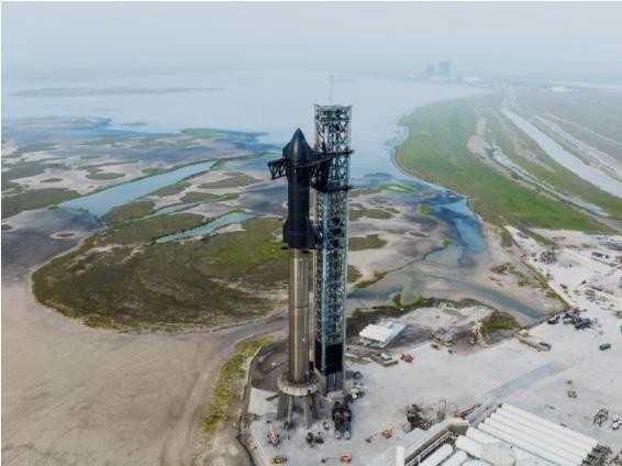 在得克薩斯州南部博卡奇卡村附近的基地中,SpaceX 公司的第一艘軌道星際飛船放置在其巨大的超級(jí)重型助推器之上。