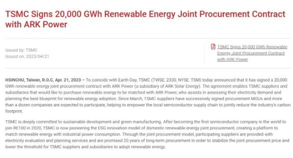 臺(tái)積電宣布與誠(chéng)新電力(誠(chéng)新綠能子公司)簽署長(zhǎng)期協(xié)議,將在 20 年內(nèi)每年購(gòu)買(mǎi) 1000GWh 可再生能源,共 20000GWh,約為 25 萬(wàn)戶家庭一年用電量。臺(tái)積電將每年認(rèn)購(gòu) 500GWh,另外 500GWh 則邀請(qǐng)供應(yīng)商共同認(rèn)購(gòu),預(yù)計(jì)每年將降低 50 萬(wàn)公噸二氧化碳排放量。