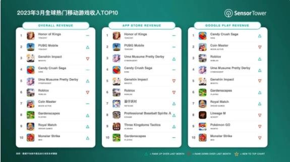 Sensor Tower 商店情報數據顯示,2023 年 3 月騰訊《王者榮耀》在全球 App Store 和 Google Play 吸金 2.15 億美元(IT之家備注:當前約 14.79 億元人民幣),蟬聯全球手游暢銷榜冠軍。騰訊《PUBG Mobile》(合并《和平精英》收入)排名第二,米哈游《原神》第三。