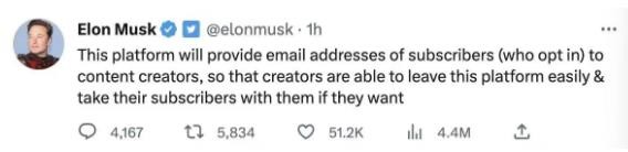 馬斯克今日發(fā)布推文,稱推特將向內(nèi)容創(chuàng)作者提供訂閱者的電子郵件地址。馬斯克稱,此舉是為了讓創(chuàng)作者能夠輕松離開該平臺(tái)并在需要時(shí)帶走他們的訂閱者。