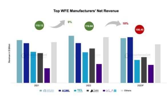 報告中指出 WFE 市場在連續 3 年增長之后,預估 2023 年凈收入為 1084.5 億美元(當前約 7754.18 億元人民幣),同比下降 10%。