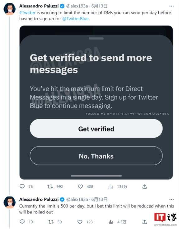不過,Paluzzi 并未透露推特將在何時實施這一新限制,但根據(jù)其爆料經(jīng)驗,通常這些新限制會在幾個月甚至幾周內(nèi)實施。