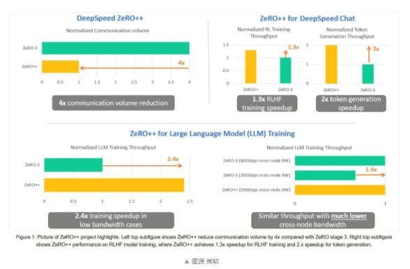 這些改進(jìn)的通信技術(shù)大大減少了通信量,微軟研究人員表示,與 ZeRO 相比,ZeRO++ 減少了高達(dá) 4 倍的通信量,提高了訓(xùn)練吞吐量和效率。當(dāng)在每個(gè) GPU 上使用小批量大小時(shí),在高帶寬集群中,ZeRO++ 相比 ZeRO-3 的吞吐量提高了 28% 至 36%。在低帶寬集群中,與 ZeRO-3 相比,ZeRO++ 實(shí)現(xiàn)了平均 2 倍的加速,使得大模型訓(xùn)練在更多種類的集群上更為可行。