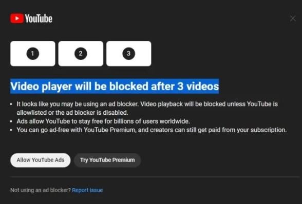YouTube 正在進行一項新的實驗,旨在限制廣告攔截器的使用,要求用戶在觀看三個視頻后關閉廣告攔截器或者購買高級訂閱服務。