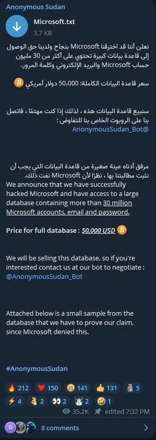 微軟今年 6 月承認旗下 OneDrive、Microsoft 365、Azure 云服務受到黑客 DDoS 攻擊,導致服務反復中斷。一個名為 Anonymous Sudan 的黑客組織日前宣稱,該攻擊行動由他們所負責。該黑客組織同時聲稱,他們已經黑入了微軟服務器,并從中獲取了 3000 萬條用戶信息數據。