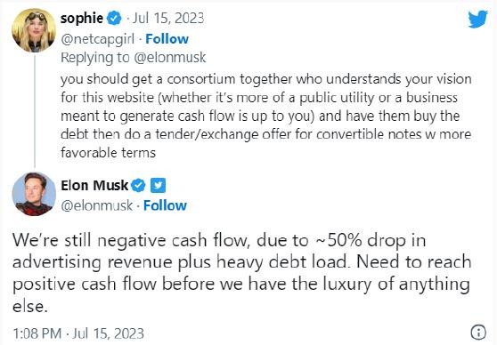 在解雇了數千名員工并削減了云服務費用后,馬斯克曾表示,該公司將非債務支出從 2023 年預期的 45 億美元削減至 15 億美元。此外,推特在 440 億美元的收購交易中承擔了債務,因此每年還需要支付 15 億美元的利息。