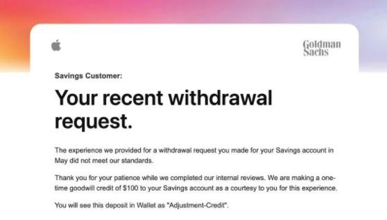 蘋果和高盛為了補償這些提現困難的用戶,表示一次性補償 100 美元,目前尚不清楚有多少 Apple Savings 用戶收到了這些“善意信貸”。