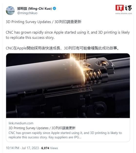 蘋(píng)果要用:郭明錤稱(chēng) 3D 打印有可能會(huì)復(fù)制 CNC 的成功故事 09:49:25