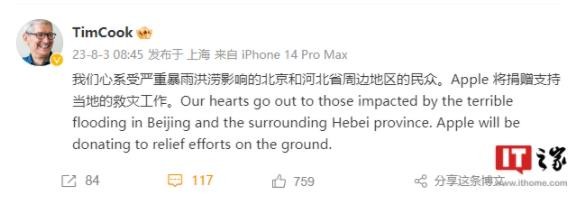 剛剛,蘋果公司 CEO 庫克在微博宣布:我們心系受嚴重暴雨洪澇影響的北京和河北省周邊地區的民眾。Apple 將捐贈支持當地的救災工作。