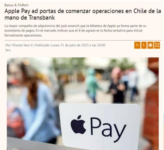 據智利金融報紙《Diario Financeiro》報道,智利銀行業巨頭 Transbank 在社交媒體上分享了一篇帖子:歡迎 Apple Pay 進入該國。盡管該帖子后來被刪除,但記者 Pedro Martín 獨立向“至少四個來自金融機構的消息來源”證實,Apple Pay 定于 8 月 8 日在智利正式推出。